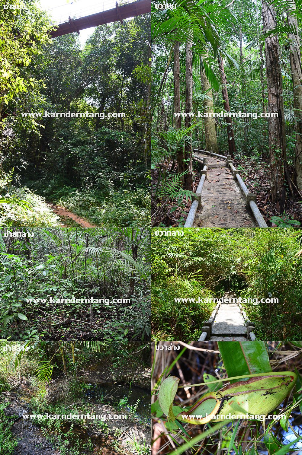 ซ้ายล่าง – ทางเดินช่วงนี้รายล้อมด้วยต้นปาล์มชวา ขณะที่ต้นไม้ใหญ่รอบข้างก็เช่น ต้นคอแล้ง ต้นสะท้อนรอก ฯลฯ