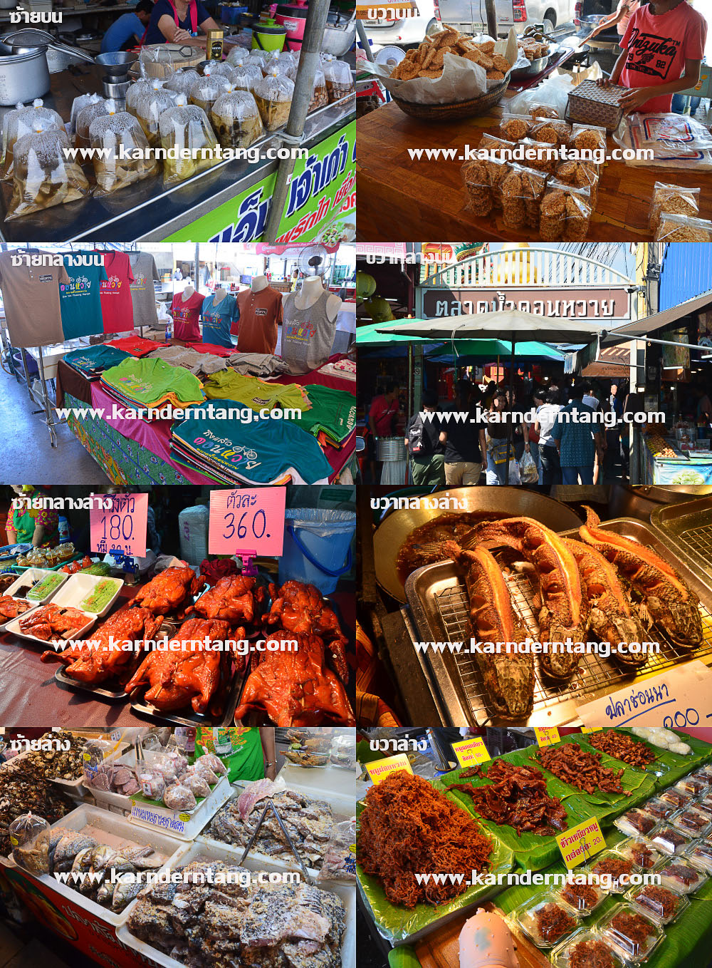 ซ้ายกลางบน - ร้านนี้มีของกินหลายอย่างให้ช้อปดังนี้ หมี่กรอบ หอยดอง ปลาทอด หมูแดดเดียวทอด หมูหยอง หมูฝอย หอยแครงดอง ก้างปลาข้างเหลือง ปลาซิวกรอบ ปลาแก้วสามรส ไปจนถึงหมึกแห้ง